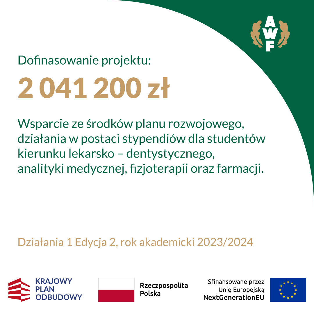 Miło nam poinformować, że nasza Uczelnia otrzymała dofinansowanie w wysokości 2 041 200 zł ze środków Krajowego Planu Odbudowy i Zwiększania Odporności na realizację projektu pt. „Objęcie wsparciem ze środków Planu rozwojowego działania w postaci stypendiów dla studentów kierunków: lekarsko-dentystycznego, analityki medycznej, fizjoterapii oraz farmacji. Działanie 1, Edycja 2, rok akademicki 2023/2024”.